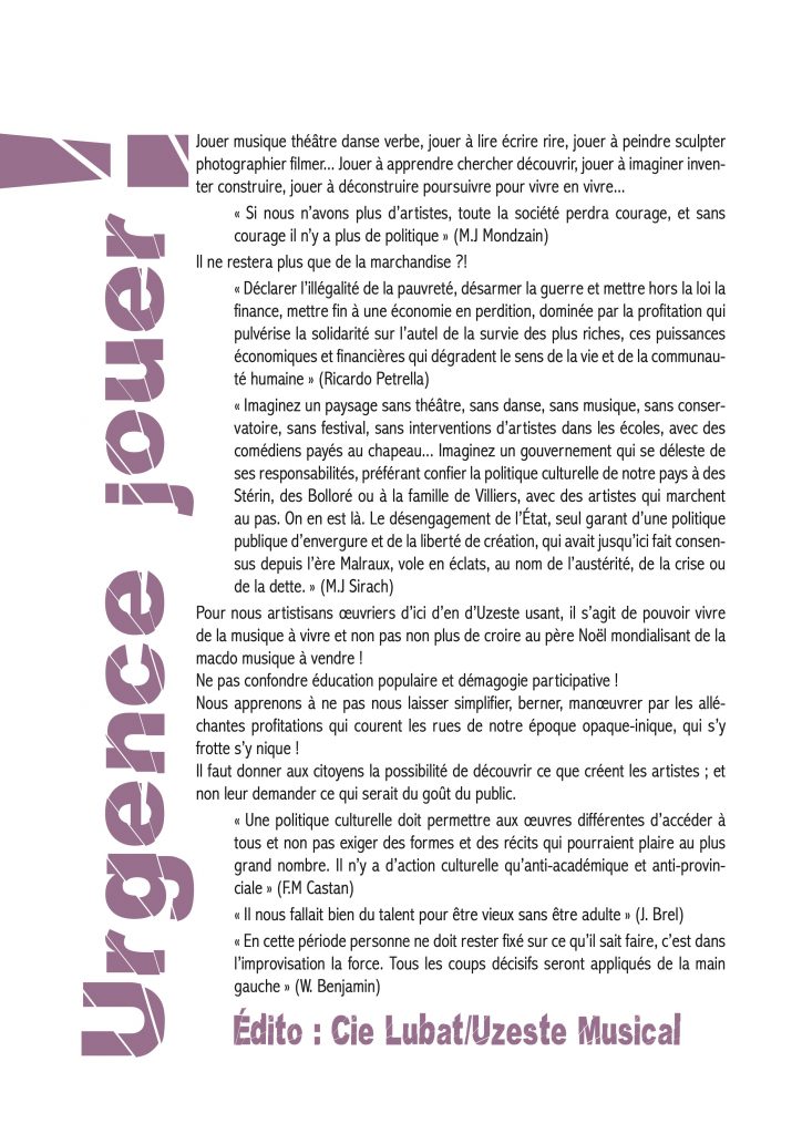 Soutenir Uzeste Musical c’est se positionner clairement comme évaluateur de ce qui fait sens, pour vous, dans le paysage culturel et artistique contemporain et participe à la construction de votre représentation du monde.